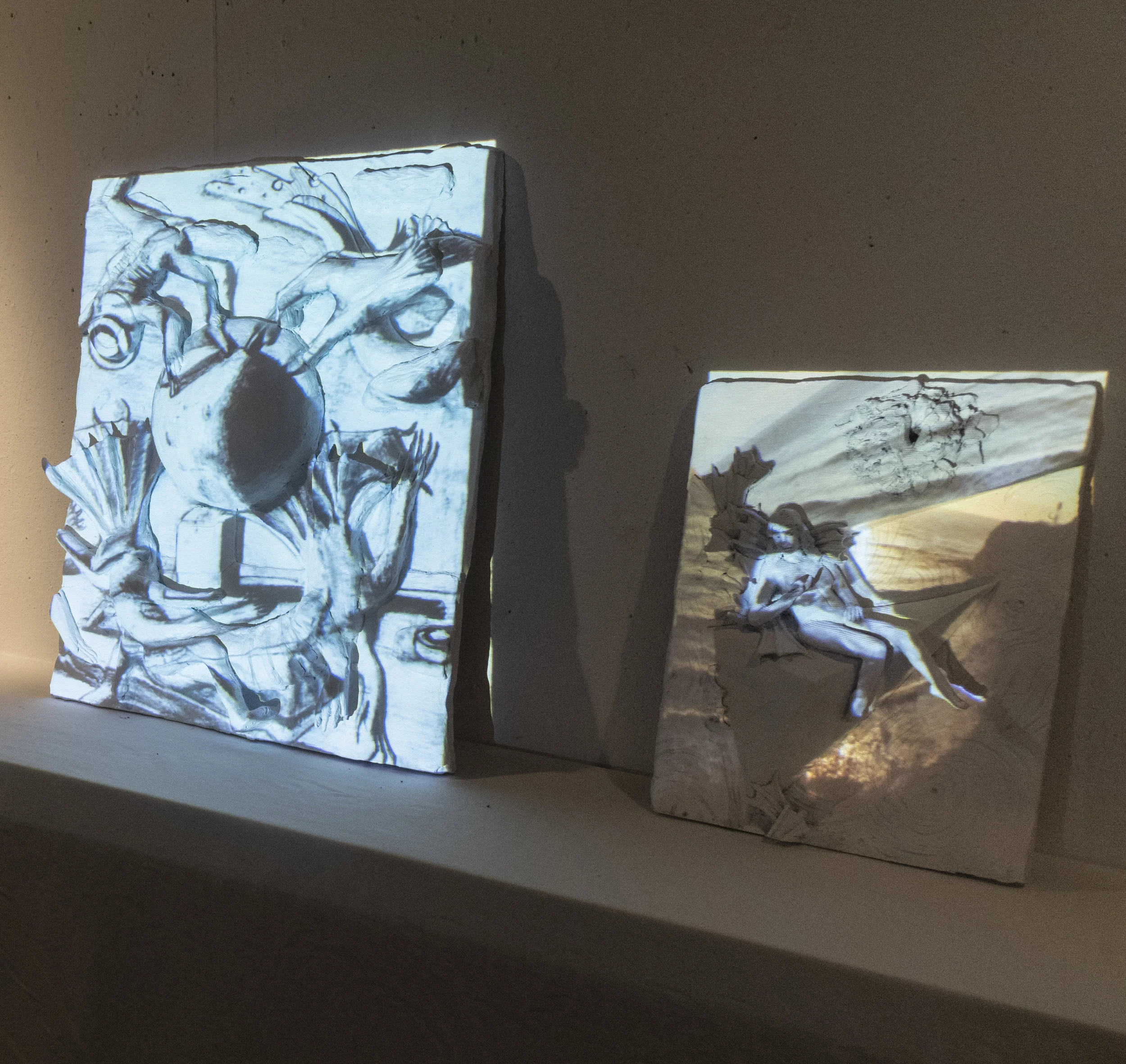 Monster Relief and By the Shore, installed at Vassar College with accompanying projections, 2018.